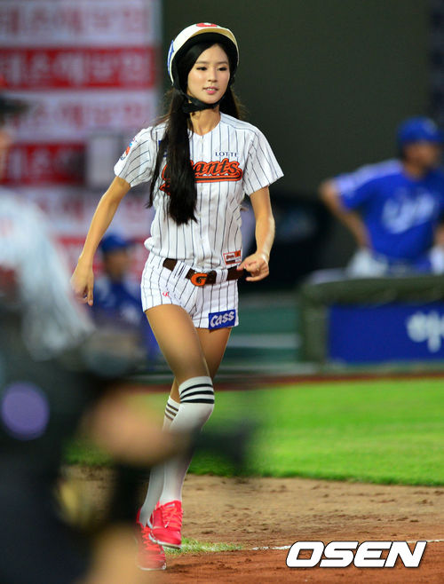 2일 오후 부산 사직구장에서 열린 롯데 자이언츠와 삼성 라이온스의 경기, 롯데 치어리더 박기량이 배트걸로 변신해 그라운드에 들어서고 있다