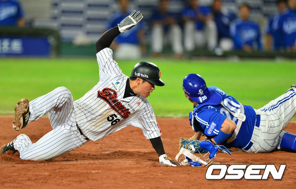 2일 오후 부산 사직구장에서 열린 롯데 자이언츠와 삼성 라이온스의 경기, 5회말 1사 1,3루에서 롯데 황재균의 좌익수 플라이에 3루주자 신본기가 태그업, 삼성 진갑용의 태그를 피해 홈에서 세이프되고 있다