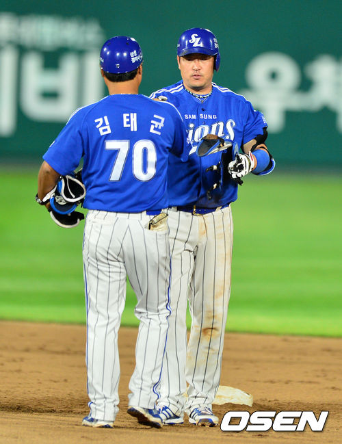 2일 오후 부산 사직구장에서 열린 롯데 자이언츠와 삼성 라이온스의 경기, 6회초 2사 만루에서 삼성 진갑용이 역전 우전 적시타를 날리고 김태균 코치와 기뻐하고 있다.