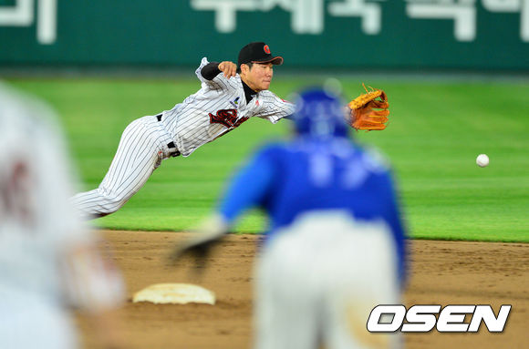 2일 오후 부산 사직구장에서 열린 롯데 자이언츠와 삼성 라이온스의 경기, 6회초 1사 만루에서 삼성 박석민의 1타점 중전 적시타 타구를 잡기 위해 롯데 신본기가 몸을 날리고 있다.