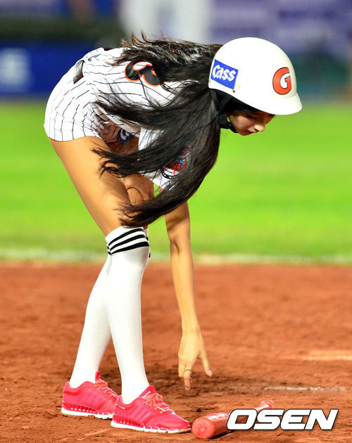 2일 오후 부산 사직구장에서 열린 롯데 자이언츠와 삼성 라이온스의 경기, 롯데 치어리더 박기량이 배트걸로 변신해 그라운드에서 배트를 정리하고 있다.