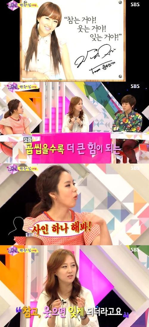 장윤정은 2일 오후 방송된 SBS 예능프로그램 ‘화신, 마음을 지배하는 자’(이하 ‘화신’)에서 '참는 거야. 웃는 거야. 잊는 거야'라는 글귀를 소개하며 "지금의 상황 때문에 무겁게 느껴질 수도 있겠지만, 데뷔 때부터 차에 붙여놓고 생활했다. 10년을 버티게 해 준 글귀다"라고 입을 뗐다.