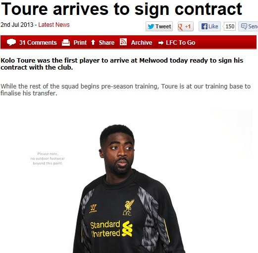 리버풀은 2일 구단 공식 홈페이지를 통해 "콜로 투레를 영입했다"고 공식 발표했다. 투레는 지난 시즌을 끝으로 은퇴한 리버풀의 레전드 제이미 캐러거의 공백을 메운다. 기존의 마틴 스크르텔, 다니엘 아게르, 세바스티안 코아테스와 함께 리버풀의 중앙 수비를 책임진다.
