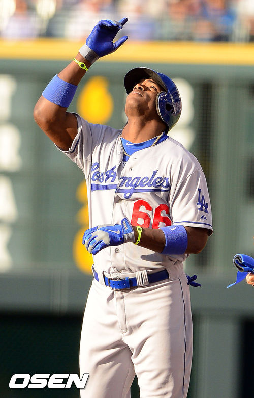 [OSEN=덴버(미국), 곽영래 기자] 3일(한국시간) 미국 콜로라도주 덴버 쿠어스필드에서 열린 2013 미국 메이저리그 콜로라도 로키스와 LA 다저스의 경기, 1회말 1사 다저스 푸이그가 안타를 날리고 세레모니를 하고 있다.