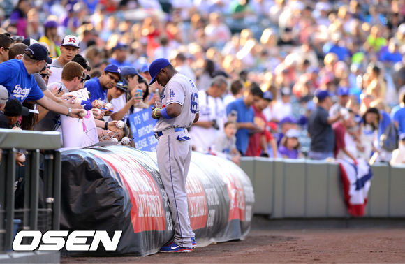 [OSEN=덴버(미국), 곽영래 기자] 3일(한국시간) 미국 콜로라도주 덴버 쿠어스필드에서 열린 2013 미국 메이저리그 콜로라도 로키스와 LA 다저스의 경기에 앞서 다저스 푸이그가 팬들에게 사인을 하고 있다