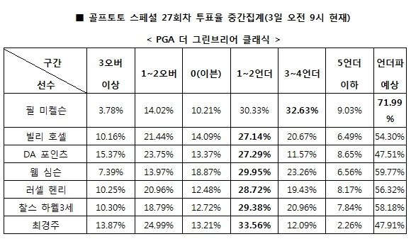필 미켈슨에 이어 웹 심슨의 언더파 예상이 59.77%로 높게 예상됐고, 찰스 하웰3세의 언더파 예상이 58.18%로 뒤를 이었다. 이어 러셀 헨리(56.32%), 빌리 호셀(54.30%)의 언더파 예상이 뒤를 이었으며, 최경주(47.91%), DA 포인츠(47.51%)의 언더파 예상은 비교적 낮게 나타났다.