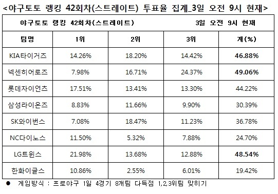 국민체육진흥공단(www.kspo.or.kr)이 발행하는 체육진흥투표권 수탁사업자인 스포츠토토 공식발매사이트인 베트맨(www.betman.co.kr)은 4일에 개최되는 LG-한화, SK-KIA, 롯데-삼성, NC-넥센 등 4경기 8개팀을 대상으로 한 야구토토 랭킹 42회차 스트레이트 게임 중간집계결과 넥센(49.06%), LG(48.54%), KIA(46.88%)를 차례로 다득점 상위 3개팀으로 꼽았다고 밝혔다. 반면 NC(24.70%), 한화(19.42%)는 가장 적은 득점을 기록할 것으로 예상했다.
