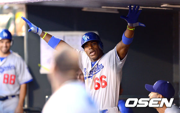 [OSEN=덴버(미국), 곽영래 기자] 3일(한국시간) 미국 콜로라도주 덴버 쿠어스필드에서 열린 2013 미국 메이저리그 콜로라도 로키스와 LA 다저스의 경기, 7회초 다저스 선두타자 푸이그가 솔로홈런을 날리고 환호하고 있다.