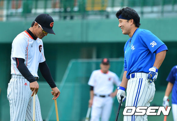 3일 오후 부산 사직구장에서 열리는 롯데 자이언츠와 삼성 라이온스의 경기, 경기에 앞서 롯데 공필성 코치와 삼성 이승엽이 이야기를 나누며 즐거워하고 있다.