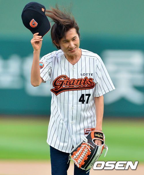 3일 오후 부산 사직구장에서 열린 롯데 자이언츠와 삼성 라이온스의 경기, 경기에 앞서 부산 아시아탁구선수권대회 홍보팀장을 맡고 있는 현정화 감독이 시구자로 나서 팬들에게 인사를 하고 있다.