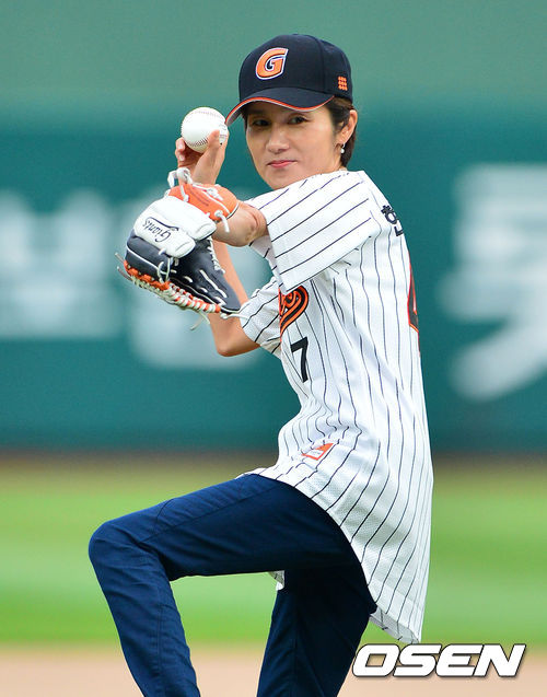 3일 오후 부산 사직구장에서 열린 롯데 자이언츠와 삼성 라이온스의 경기, 경기에 앞서 부산 아시아탁구선수권대회 홍보팀장을 맡고 있는 현정화 감독이 시구를 하고 있다.
