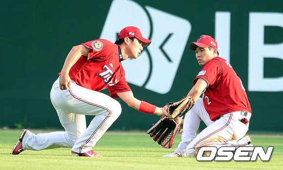 3일 오후 인천 문학야구장에서 열린 '2013 한국야쿠르트 세븐프로야구' SK 와이번스와 KIA 타이거즈의 경기, 1회말 1사 KIA 김주찬과 신종길이 SK 조동화의 타구를 잡으려 하고 있다.