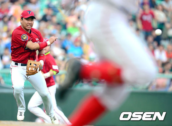 3일 오후 인천 문학야구장에서 열린 '2013 한국야쿠르트 세븐프로야구' SK 와이번스와 KIA 타이거즈의 경기, 2회말 무사 1루 KIA 이범호가 SK 한동민의 내야 땅볼 타구를 잡아 1루로 송구하고 있다. 결과는 세이프.