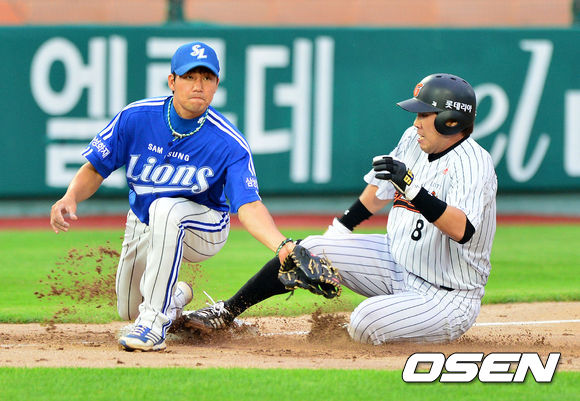 3일 오후 부산 사직구장에서 열린 롯데 자이언츠와 삼성 라이온스의 경기, 2회말 1사 1,2루에서 롯데 2루주자 전준우가 정훈의 보내기 번트에 3루에서 삼성 김상수에 태그아웃당하고 있다.