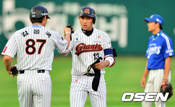 3일 오후 부산 사직구장에서 열린 롯데 자이언츠와 삼성 라이온스의 경기, 2회말 1사 만루에서 롯데 황재균이 역전 2타점 적시 2루타를 날리고 김응국 코치와 주먹을 맞대고 있다.