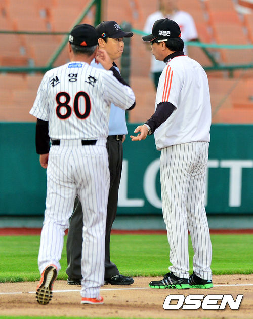 3일 오후 부산 사직구장에서 열린 롯데 자이언츠와 삼성 라이온스의 경기, 2회말 무사 1,2루에서 롯데 2루 주자 전준우가 신본기의 보내기 번트에 삼성 김상수에 포스아웃당하자 김시진 감독이 그라운드에 나와 이계성 3루심에 불만을 나타내고 있다.