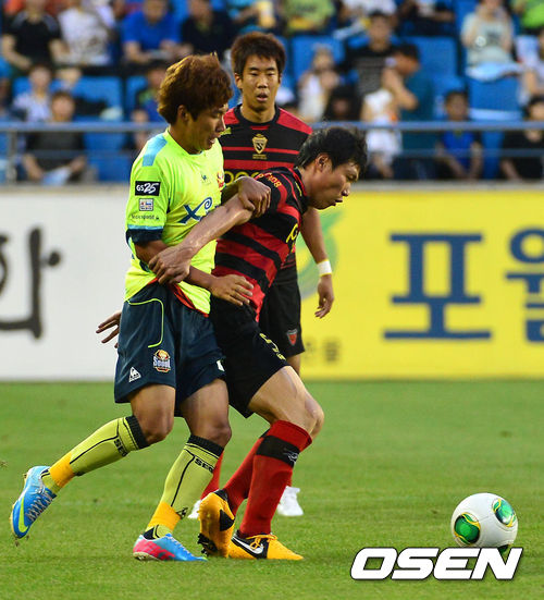 3일 오후 경상북도 포항시 포항스틸야드 경기장에서 '2013 현대오일뱅크 K리그 클래식' 포항 스틸러스 대 FC서울의 경기가 열렸다. 전반 포항 김태수와 FC서울 윤일록이 볼다툼을 벌이고 있다.