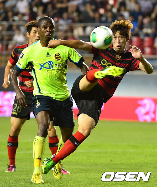 3일 오후 경상북도 포항시 포항스틸야드 경기장에서 '2013 현대오일뱅크 K리그 클래식' 포항 스틸러스 대 FC서울의 경기가 열렸다. 전반 포항 배천석이 발리슛을 시도하고 있다.
