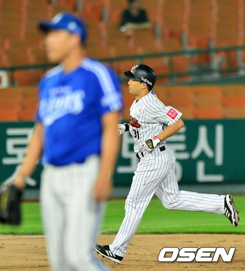 3일 오후 부산 사직구장에서 열린 롯데 자이언츠와 삼성 라이온스의 경기, 5회말 무사에서 롯데 손아섭이 솔로포를 날리고 그라운드를 돌고 있다.