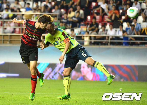 3일 오후 경상북도 포항시 포항스틸야드 경기장에서 '2013 현대오일뱅크 K리그 클래식' 포항 스틸러스 대 FC서울의 경기가 열렸다. 전반 포항 배천석이 헤딩슛을 시도하고 있다.