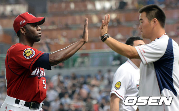 3일 오후 인천 문학야구장에서 열린 '2013 한국야쿠르트 세븐프로야구' SK 와이번스와 KIA 타이거즈의 경기, 5회말 KIA 소사가 수비를 마치고 더그아웃으로 들어오면서 김진우와 하이파이브를 하고 있다.