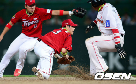 3일 오후 인천 문학야구장에서 열린 '2013 한국야쿠르트 세븐프로야구' SK 와이번스와 KIA 타이거즈의 경기, 5회말 1사 1루 KIA 김선빈이 SK 박진만의 타구를 슬라이딩 캐치고 잡아내고 있다.