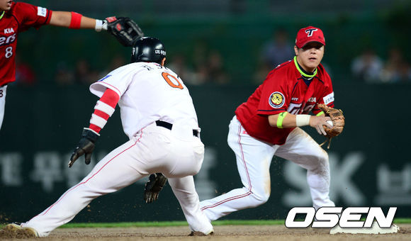 3일 오후 인천 문학야구장에서 열린 '2013 한국야쿠르트 세븐프로야구' SK 와이번스와 KIA 타이거즈의 경기, 5회말 1사 1루 KIA 김선빈이 SK 박진만의 타구를 슬라이딩 캐치고 잡아낸 뒤 2루주자 김강민을 바라보고 있다.