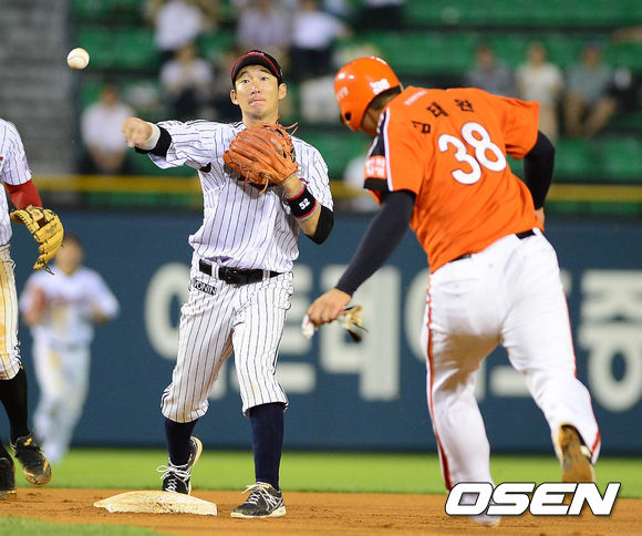 3일 오후 서울 잠실구장에서 열린 '2013 한국야쿠르트 세븐 프로야구' LG 트윈스와 한화 이글스의 경기 6회초 1사 1루 오선진의 땅볼을 손주인이 2루에서 김태완을 포스아웃 시킨후 1루로 송구하고 있다.