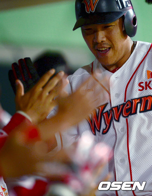3일 오후 인천 문학야구장에서 열린 '2013 한국야쿠르트 세븐프로야구' SK 와이번스와 KIA 타이거즈의 경기, 7회말 2사 2,3루 3루주자 SK 정근우가 KIA 소사의 보크로 동점을 만든 뒤 동료들과 기뻐하고 있다.