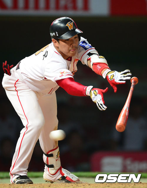 3일 오후 인천 문학야구장에서 열린 '2013 한국야쿠르트 세븐프로야구' SK 와이번스와 KIA 타이거즈의 경기, 9회말 1사 1,3루 SK 정근우가 스퀴즈 번트를 시도하였지만 실패하고 있다.