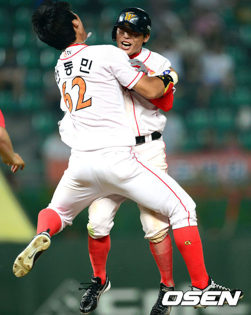 9회말 2사 1,2루 끝내기 안타를 때린 SK 조동화가 한동민과 기뻐하고 있다. / youngrae@osen.co.kr
