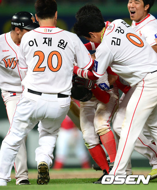 9회말 2사 1,2루 끝내기 안타를 때린 SK 조동화가 동료들에게 둘러쌓여 축하받고 있다. / youngrae@osen.co.kr