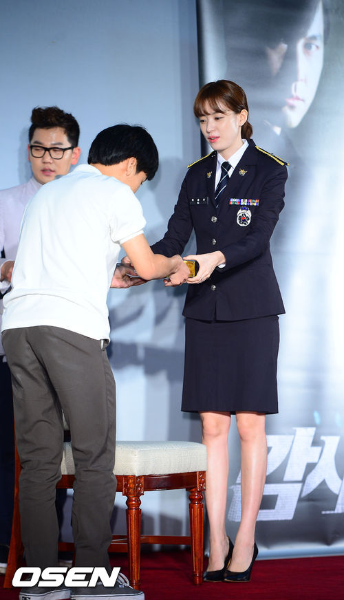 배우 한효주가 3일 밤 서울 서대문구 미근동서대문 경찰청 지하대강당에서 열린 영화 '감시자들'(감독 조의석, 김병서) 관객과의 대화에 참석해 팬에게 선물을 주고 있다.