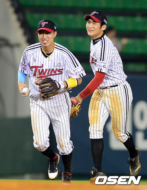 3일 오후 서울 잠실구장에서 열린 '2013 한국야쿠르트 세븐 프로야구' LG 트윈스와 한화 이글스의 경기 종료 후 오지환과 정성훈이 승리를 기뻐하고 있다.