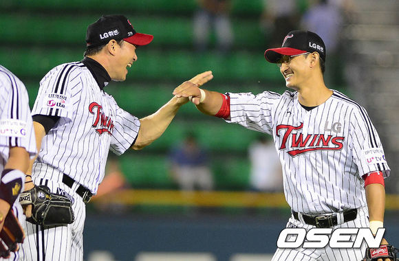 3일 오후 서울 잠실구장에서 열린 '2013 한국야쿠르트 세븐 프로야구' LG 트윈스와 한화 이글스의 경기 종료 후 봉중근과 박용택이 하이파이브를 하고 있다.