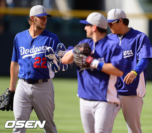 [OSEN=덴버(미국), 곽영래 기자] 4일(한국시간) 미국 콜로라도주 덴버 쿠어스필드에서 열린 2013 미국 메이저리그 콜로라도 로키스와 LA 다저스의 경기에 앞서 류현진이 커쇼의 신발을 건네주고 있다
