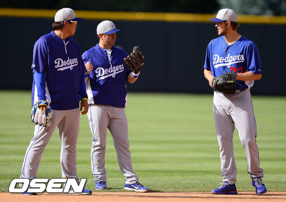 [OSEN=덴버(미국), 곽영래 기자] 4일(한국시간) 미국 콜로라도주 덴버 쿠어스필드에서 열린 2013 미국 메이저리그 콜로라도 로키스와 LA 다저스의 경기에 앞서 커쇼와 류현진이 다저스 내야수 푼토와 이야기를 나누고 있다.
