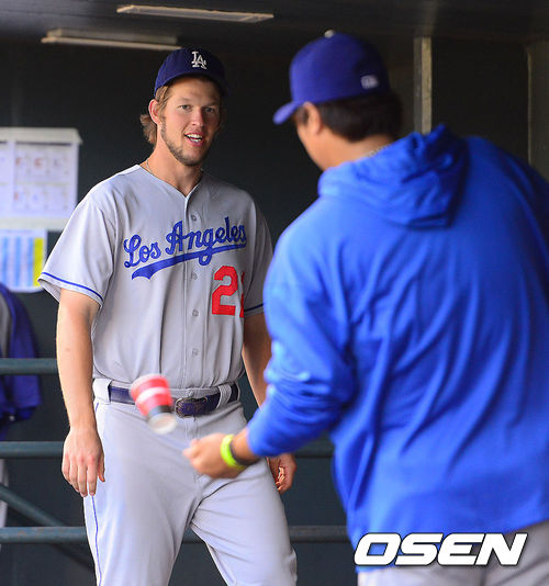 [OSEN=덴버(미국), 곽영래 기자] 4일(한국시간) 미국 콜로라도주 덴버 쿠어스필드에서 열린 2013 미국 메이저리그 콜로라도 로키스와 LA 다저스의 경기에 앞서 다저스 커쇼가 종이컵 돌리는 류현진을 바라보고 있다.