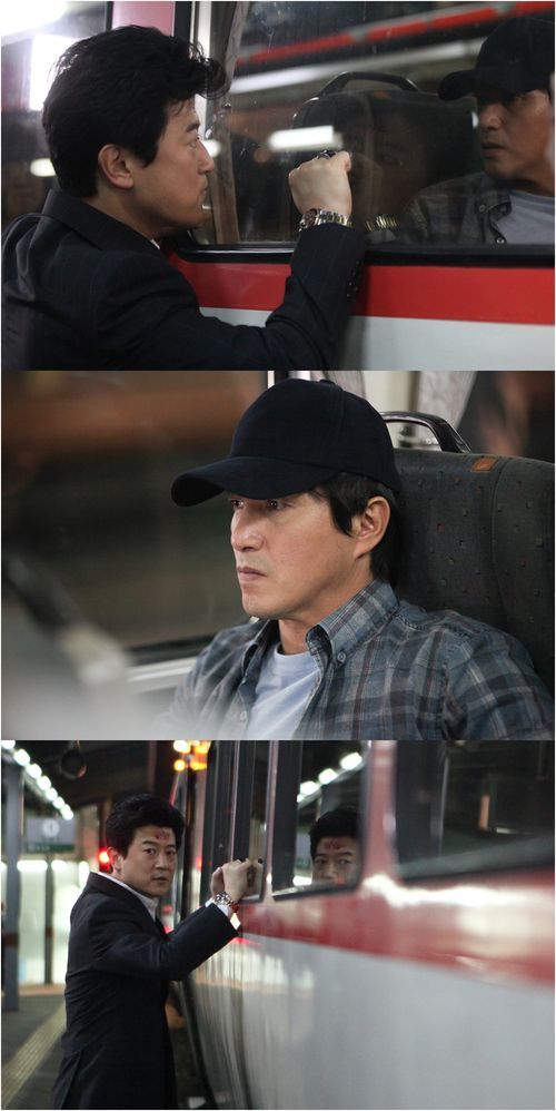 사진 속 두 사람운 각각 상황에 맞는 뛰어난 눈빛 연기로 팽팽한 긴장감을 만들어 내고 있다. 조재현은 기차 안에서 초점이 없는 눈빛으로 창밖을 응시하며 내면의 불안함을, 박상민은 아들을 유괴한 범인을 눈앞에 둔 초조함과 분노의 심리를 표현하고 있는 것.