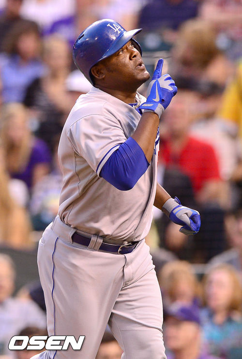 [OSEN=덴버(미국), 곽영래 기자] 4일(한국시간) 미국 콜로라도주 덴버 쿠어스필드에서 열린 2013 미국 메이저리그 콜로라도 로키스와 LA 다저스의 경기, 4회초 2사 1루 다저스 우리베가 동점 2점 홈런을 날리고 환호하고 있다.