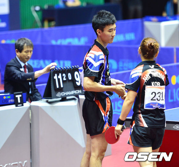 4일 오후 부산 사직실내체육관에서 열린 제 21회 아시아 탁구선수권대회 혼합복식 8강전 대한민국 이상수(삼성생명)-박영숙(KRA한국마사회) 조가 홍콩 장티안위-리호칭 조에 3-0으로 가볍게 승리를 거두고 4강에 진출했다.