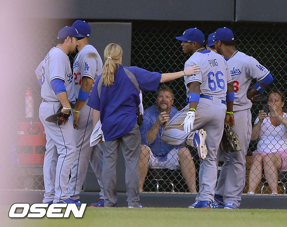 [OSEN=덴버(미국), 곽영래 기자] 4일(한국시간) 미국 콜로라도주 덴버 쿠어스필드에서 열린 2013 미국 메이저리그 콜로라도 로키스와 LA 다저스의 경기, 5회말 콜로라도 아레나도의 외야플라이때 호수비 펼친 푸이그가 펜스와 부딪힌 후 쓰러진 후 자리에 일어나 스트레칭을 하고 있다.