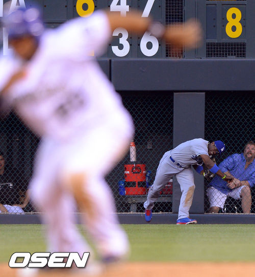 [OSEN=덴버(미국), 곽영래 기자] 4일(한국시간) 미국 콜로라도주 덴버 쿠어스필드에서 열린 2013 미국 메이저리그 콜로라도 로키스와 LA 다저스의 경기, 5회말 콜로라도 아레나도의 외야플라이때 호수비 펼친 푸이그가 펜스와 부딪힌 후 송구하고 있다.