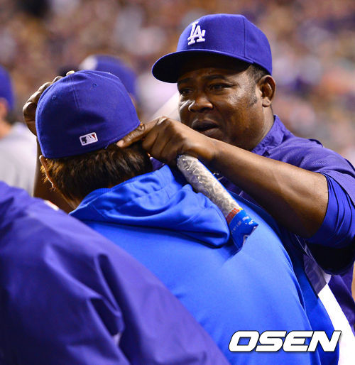 [OSEN=덴버(미국), 곽영래 기자] 4일(한국시간) 미국 콜로라도주 덴버 쿠어스필드에서 열린 2013 미국 메이저리그 콜로라도 로키스와 LA 다저스의 경기, 다저스 우리베가 류현진에게 꿀밤을 때리고 있다.