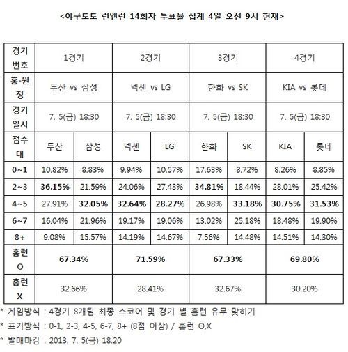 [야구토토] 국민체육진흥공단(www.kspo.or.kr)이 발행하는 체육진흥투표권 수탁사업자인 스포츠토토 공식 온라인 발매 사이트인 베트맨(www.betman.co.kr)이 오는 5일 오후 6시 30분부터 열리는 2013 국내프로야구(KBO) 4경기 8개 팀을 대상으로 한 야구토토 런앤런 14회차 투표율 중간집계 결과, 참가자들의 대다수인 71.59%는 넥센-LG(2경기)전에서 홈런이 나올 것으로 예상했다고 밝혔다.