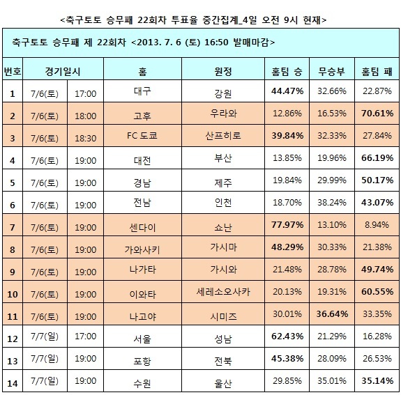 [축구토토] 국민체육진흥공단(www.kspo.or.kr)이 발행하는 체육진흥투표권 수탁사업자인 스포츠토토 온라인 공식 발매사이트 베트맨(www.betman.co.kr)은 오는 6일부터 7일에 열리는 국내 프로축구 K리그 클래식 7경기와 일본 프로축구(J리그) 7경기 등 총 14경기를 대상으로 한 축구토토 승무패 22회차 투표율 중간집계 결과, 포항-전북(13경기)전에서 국내 축구팬 45.38%는 포항이 승리를 거둘 것으로 예상했다고 밝혔다.
