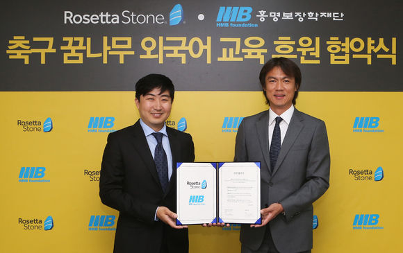 로제타스톤 코리아는 이날 진행된 후원 협약식에서 홍명보어린이축구교실과 지속적 후원 협력 관계를 체결, 연간 8000만 원 상당의 외국어 학습 프로그램을 어린이축구교실 및 FC MB 소속 축구 유망주들에게 무상으로 지원할 것을 약속했다.