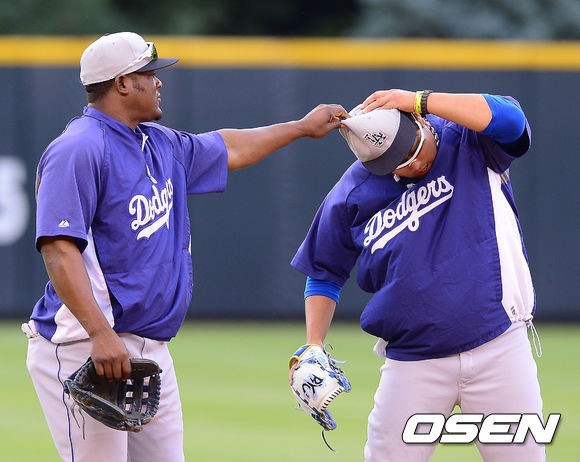 [OSEN=덴버(미국), 곽영래 기자] 5일(한국시간) 미국 콜로라도주 덴버 쿠어스필드에서 열린 2013 미국 메이저리그 콜로라도 로키스와 LA 다저스의 경기에 앞서 다저스 류현진과 우리베가 장난을 치고 있다