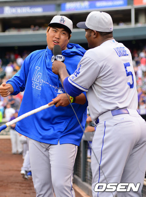 [OSEN=덴버(미국), 곽영래 기자] 5일(한국시간) 미국 콜로라도주 덴버 쿠어스필드에서 열린 2013 미국 메이저리그 콜로라도 로키스와 LA 다저스의 경기에 앞서 다저스 우리베와 류현진이 마이크를 가지고 장난을 치고 있다