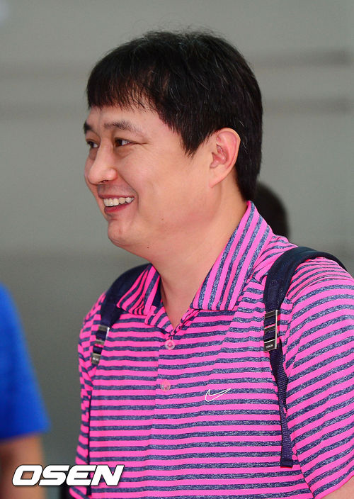 남자농구대표팀 이상범 코치가 출국장 앞에서 미소짓고 있다.